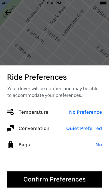 El Modo silencioso viene como parte de una nueva lista de funciones de Preferencias de usuario que los usuarios pueden configurar antes de llamar a un Uber Black o SUV, pero no mientras esperan su viaje o mientras viajan en el automóvil. Una opción de bolsas le permite a los usuarios indicar que tienen equipaje para que el conductor sepa detenerse en algún lugar donde puedan ayudar a cargarlos en el maletero. El control de temperatura les permite solicitar que el auto esté caliente o frío para que los conductores sepan si deben encender el aire acondicionado.