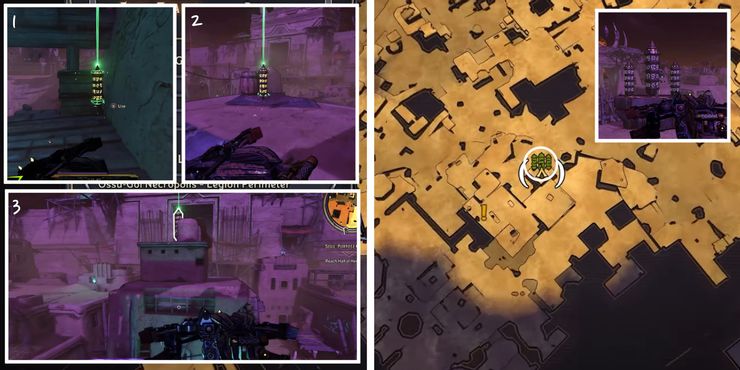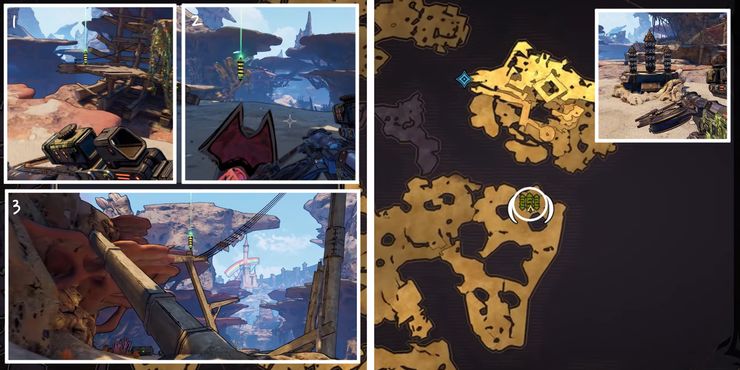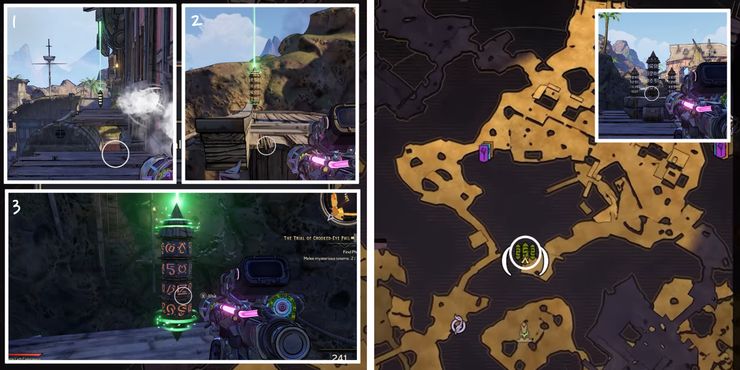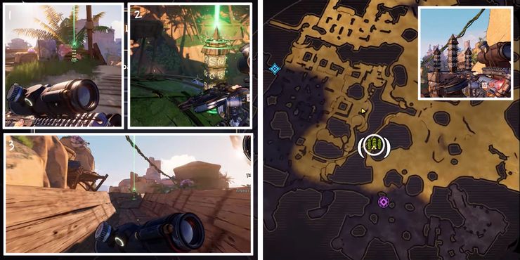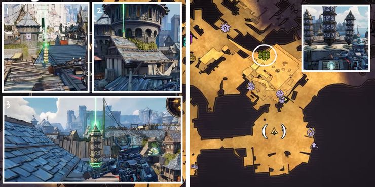 El Rune Switch Puzzle en Crackmast Cove puede ser bastante difícil de completar. Comenzando desde el interruptor cerca del pueblo hecho de partes de barcos en El país de las maravillas de Tiny Tina, corre hacia el edificio grande en el este. El primer obelisco verde está escondido en una plataforma de madera detrás de la estructura del segundo piso. Tenga cuidado con las rejillas de ventilación antes de saltar a través de las plataformas. La segunda Runa está en una azotea directamente al este de la primera, y la tercera está en la laguna del barranco más allá del marco del barco desnudo a la derecha.
