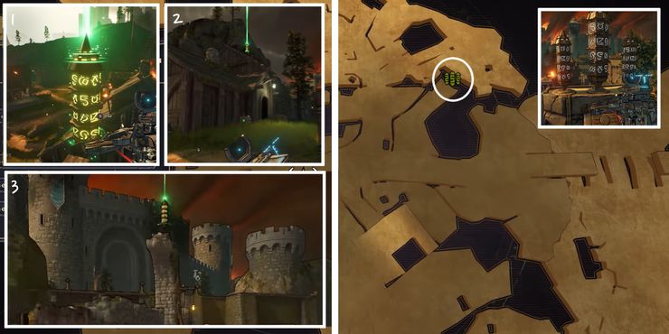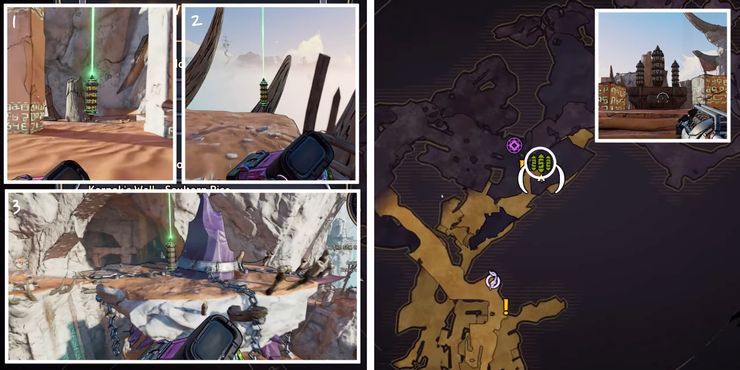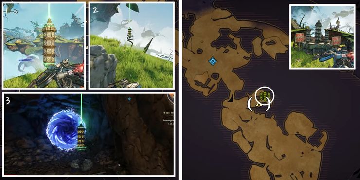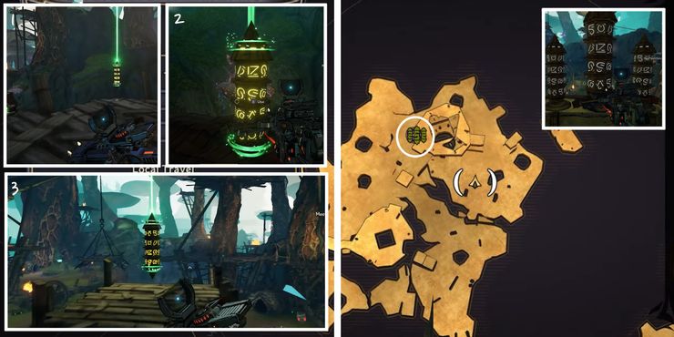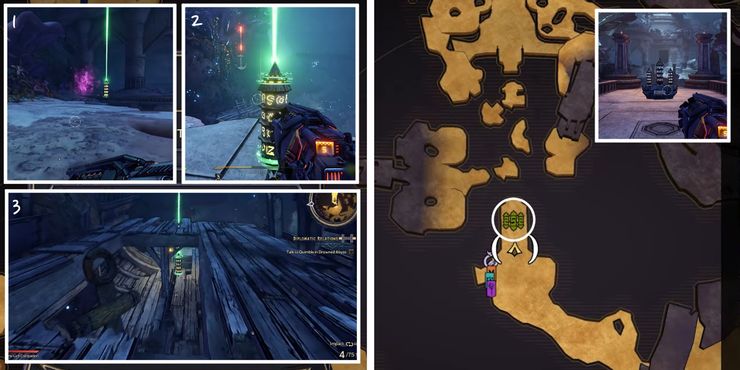 Para Wargtooth Shallows Rune Switch Puzzle, los obeliscos aparecen moderadamente lejos del dispositivo de activación, lo que puede confundir a algunos jugadores. El dispositivo está ubicado en el área al oeste del centro del mapa. Después de activar el mecanismo de cuenta regresiva en El país de las maravillas de Tiny Tina, usa la plataforma de salto a la derecha para deslizarte hacia la isla rocosa en la distancia. Sigue el camino para encontrar el primer obelisco y gira a la izquierda para descubrir el segundo detrás de una pared de madera con un agujero. El tercero se puede encontrar cerca de unos tablones de madera que forman un camino hacia el nivel superior.