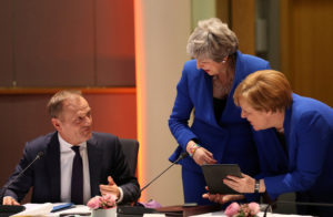 La primera ministra británica, Theresa May, y la canciller alemana, Angela Merkel, miran una tableta junto al presidente del Consejo Europeo, Donald Tusk, antes de una reunión del Consejo Europeo sobre Brexit en el edificio Europa en el Parlamento Europeo en Bruselas, Bélgica. (Foto: Kenzo Tribouillard/Pool via REUTERS)