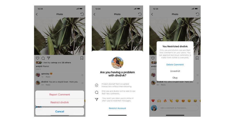 Según explica “una vez que restrinjes a alguien, los comentarios sobre tus publicaciones de esa persona solo serán visibles para ella. Puedes optar por hacer que los comentarios de una persona restringida sean visibles para los demás mediante la aprobación de sus comentarios. Las personas restringidas no podrán ver cuándo estás activo en Instagram o cuando has leído sus mensajes directos”.