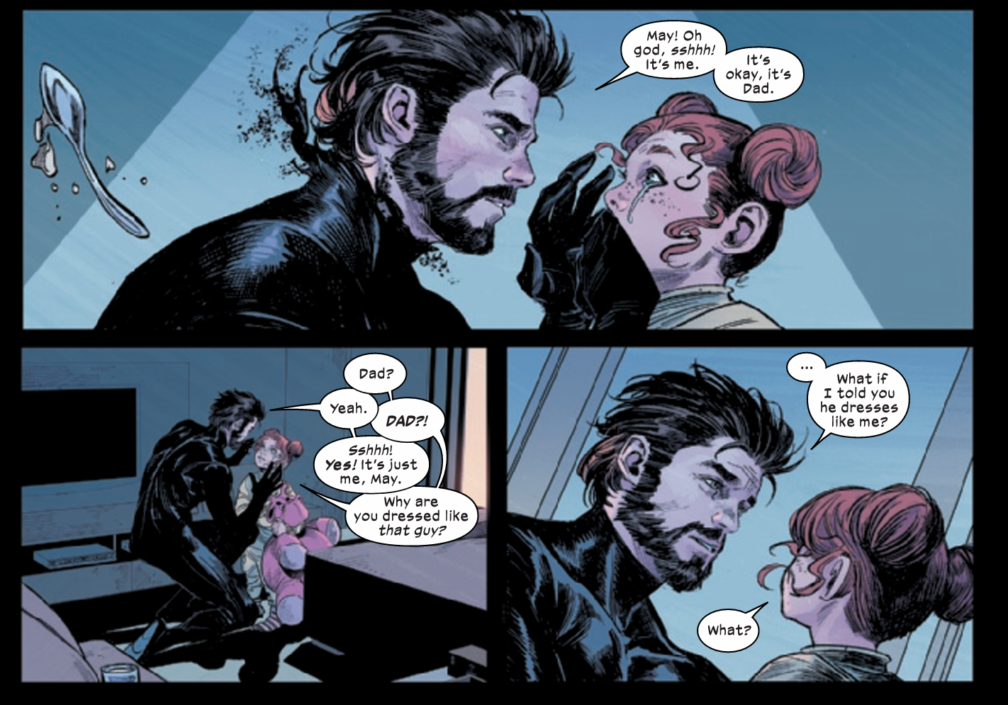 El último Hombre Araña #2 Comienza semanas después de la carrera de superhéroe de Peter, mientras lucha por adaptarse a su nueva normalidad. Sin un nombre de superhéroe ni un buen manejo de sus poderes, aún tiene que decirle a Mary Jane su identidad secreta; como le dice a May, “Había planeado decírselo, pero todavía no.” Al descubrir que su padre es Spider-Man, May es ahora la primera persona (aparte de los individuos con superpoderes como Iron Lad y Maker) en aprender sobre la doble vida de Peter. Por ahora, dice Peter, quiere que el secreto permanezca entre ellos. Los dos.