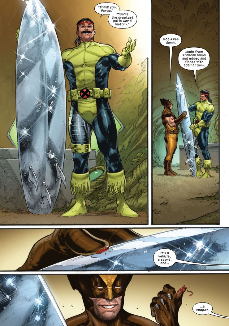 Hilarantemente, el problema revela que Wolverine le había pedido al inventor residente de Krakoa, Forge, que le construyera una tabla de surf, y aparentemente está lista para funcionar. Sin embargo, esta no es una tabla de surf cualquiera. Dado el vasto suministro de adamantium de Krakoa que se usa para recubrir los huesos de Logan en caso de que alguna vez necesite ser devuelto usando los protocolos de resurrección de la isla, Forge ha usado algunos para crear una tabla de surf cubierta de adamantium. Si bien ciertamente se ve genial y es bastante apropiado para Wolverine mientras se abre paso a través de olas masivas de 100 pies, sin duda exasperaría a Ultron de la MCU al ver que no podía soportar el uso de vibranium por parte de la humanidad “hacer un frisbee“(Escudo del Capitán América).