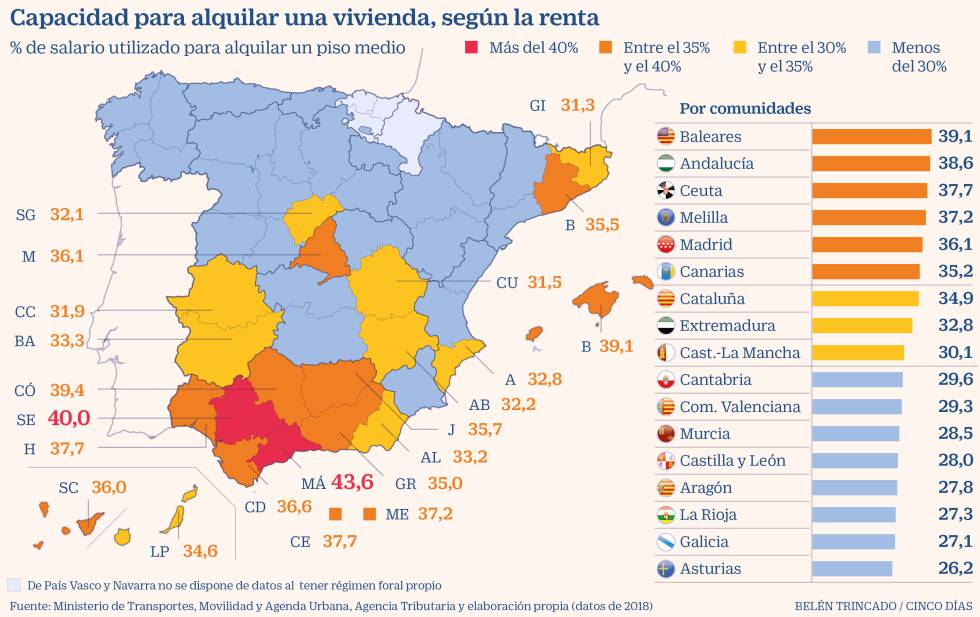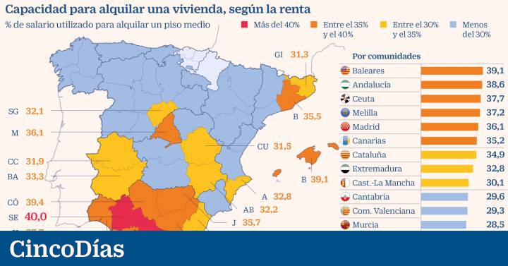 Con este tope, y siempre según los datos oficiales, los precios tendrían que abaratarse en Málaga, donde una persona tiene que destinar el 43,5% de sus ingresos para alquilar en solitario un piso medio, en Sevilla (40%) y en Córdoba (39,4%), las tres provincias que presentan los mayores desequilibrios. Otras son Baleares (39%), Huelva (37,7%), Cádiz (36%), Madrid y Santa Cruz de Tenerife (ambas con un esfuerzo del 36%) y Jaén, Barcelona y Granada, donde se dedica en torno al 35% de los ingresos a costear la vivienda.