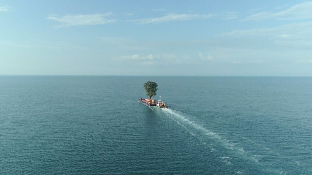 Hablamos de la escena de una película, pero no de una película de fantasía. Taming the Garden (2021) es un documental dirigido por Salomé Jashi (Tbilisi, 41 años) que narra la historia de estos árboles que viajan. Empieza precisamente con esa escena: un árbol que flota bajo un cielo nuboso, sobre un mar en calma. ¿Cómo ha llegado allí? ¿De dónde viene? ¿A dónde va?
