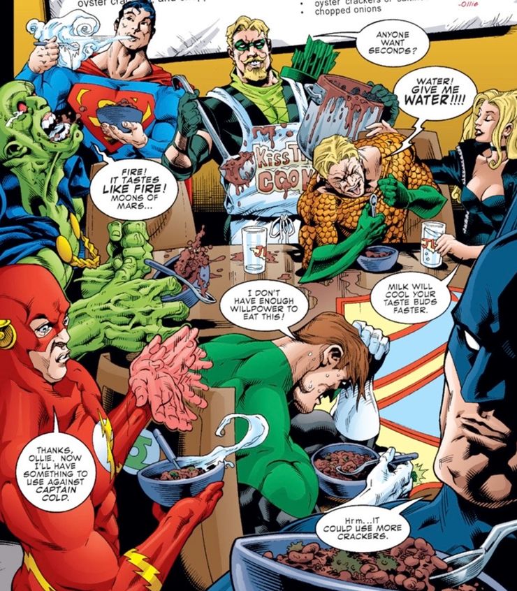 Por supuesto, el potencial destructivo del chile no se liberaría por completo hasta el 2002. Flecha verde Archivos secretos y orígenes Segmento n.º 1 “Receta de chile” (escrito por Scott McCullar, lápices de Patrick Gleason, tintas de Michael Bair, color de Tom McCraw) que no solo proporcionó a los lectores la receta completa, sino que también mostraba a Ollie sirviendo a la Liga su chile. o más exactamente, derrotándolos con él. Martian Manhunter se retuerce de dolor, el calor ardiente del chile es demasiado para su anatomía marciana. Aquaman pide agua. Superman lucha por enfriarlo con su súper aliento. Flash comenta que ahora tiene “algo para usar contra el Capitán Frío”. Green Lantern se queja de que le falta la fuerza de voluntad para comérselo.