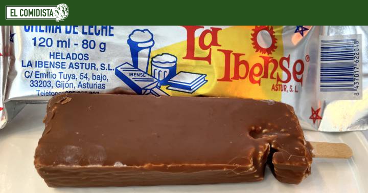 El bombón de nata de La Ibense Astur tiene el don de llevarte al pasado incluso antes de clavarle el diente. El primer impacto retro es el visual. Esperas un helado envuelto en una bolsa de plástico fino, con un diseño sencillo, obviamente, porque ya te han dicho que es artesanal y no esperas la creatividad de las grandes marcas industriales, pero nada más lejos. Es mejor.