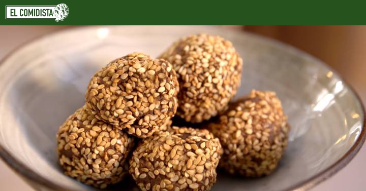 5. Volver a enfriar las bolitas y cuando estén duras rebozarlas con una mezcla de cacao natural y semillas de sésamo tostadas.
