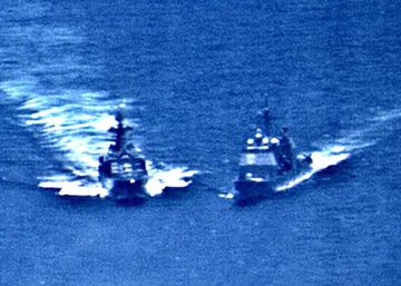Al borde de la colisión. Apenas 50 metros han separado al destructor ruso Almirante Vinogradov del buque de guerra estadounidense USS Chancellorsville en aguas del mar de China Oriental la madrugada de este viernes. El destructor ruso y el buque estadounidense se culpan mutuamente de la maniobra, que podría haber provocado un incidente internacional gravísimo. Rusia asegura que su embarcación se vio forzada a hacer la maniobra porque los estadounidenses le estaban dificultando el paso. Las fuerzas navales de EE UU alegan que Rusia es la responsable de lo ocurrido.
