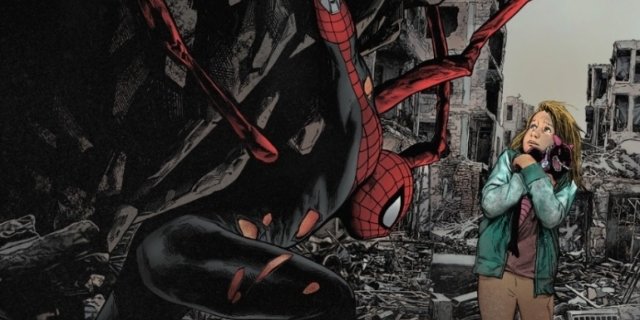En un encuentro silencioso que no conocemos, Spider-Man tranquiliza tranquilamente al niño, que solloza en sus brazos. El niño es llevado por los EMT.