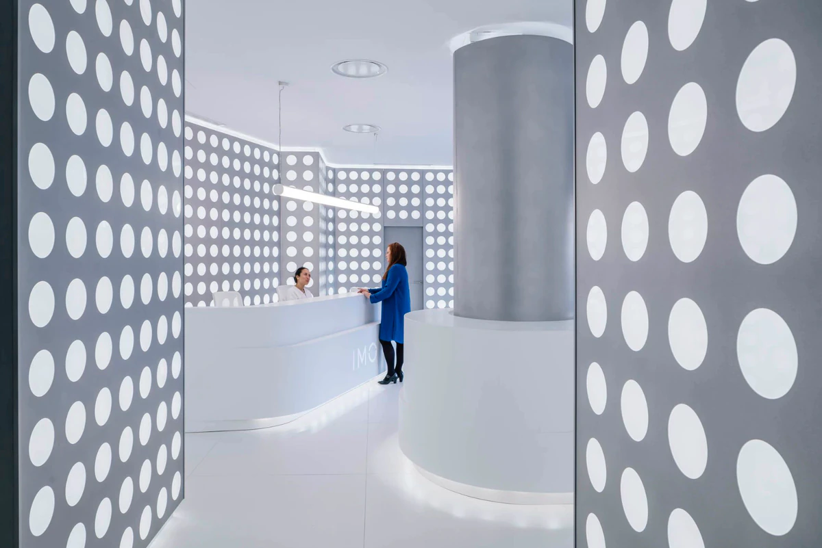 Se puede construir con luz. Hacerlo para una clínica oftalmológica requiere un ingenio extraordinario. Gon Architects firman esta hazaña al norte de Madrid. Este es un diseño espacial que, sin embargo, parece gráfico. Un grafismo que toca al usuario. Los 1.184 agujeros troquelados en las planchas metálicas que forran la zona de entrada del Instituto de Microcirugía Ocular (IMO), en el barrio de Mirasierra de Madrid, funcionan como lámparas y, a la vez, como acabado de las paredes interiores. No aportan más que un vacío y, sin embargo, transforman el espacio con juegos de luz: un abrigo luminoso que alumbra y no deslumbra.