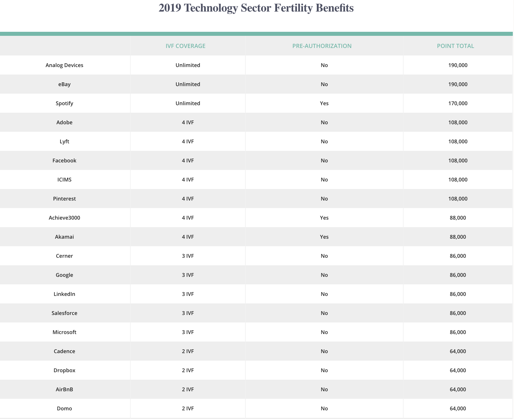 Silicon Valley semiconductor negocio Analog Devices y eBay lideró el ranking. Las dos compañías ofrecen a los empleados ciclos de FIV ilimitados sin requisitos de autorización previa, lo que significa que los empleados no necesitan el permiso de los proveedores de seguros antes de buscar ciertos servicios médicos. La autorización previa históricamente ha afectado a las lesbianas, homosexuales o empleados no afiliados al acceso a la atención rápida o en absoluto, explicó el cofundador de FertilityIQ, Jake Anderson.