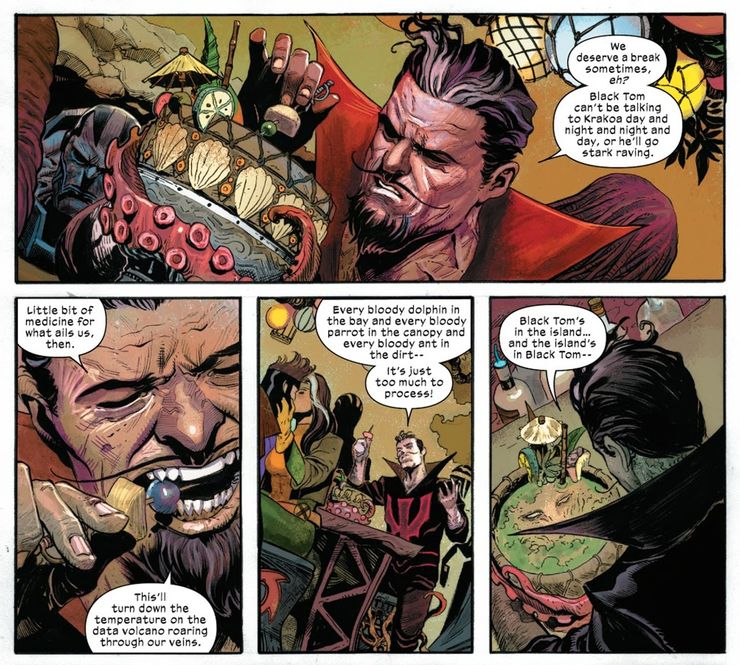 “Y Black Tom… se ha convertido en un favorito. Josh y yo realmente lo amamos. Lo quería por su conjunto de habilidades (ya que se conecta a la isla), pero me di cuenta de que alguien que se conecta constantemente a una interfaz orgánica como esa no solo es experimentará una sobrecarga sensorial, pero sin duda desarrollará una especie de trastorno disociativo. Por eso siempre habla en primera persona del plural o en tercera persona. Porque él es tanto la isla como él mismo”.