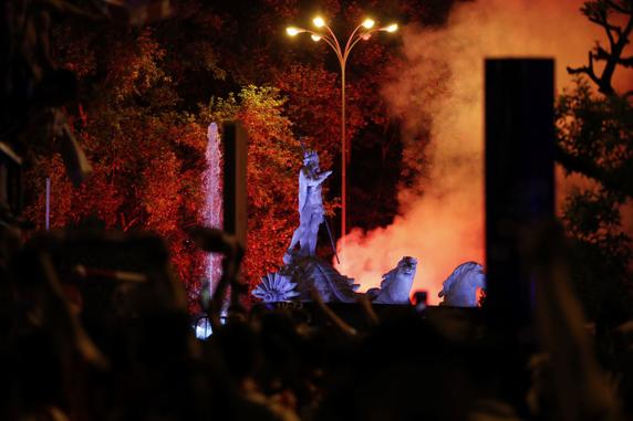 Una celebración que se alargó hasta altas horas de la madrugada y en la que no se pudo respetar la distancia de seguridad por el número de aficionados que se dieron cita en el monumento madrileño.