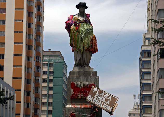 Un grupo de activistas interviene la estatua de Isabel la Católica en La Paz con ropa de mujer indígena