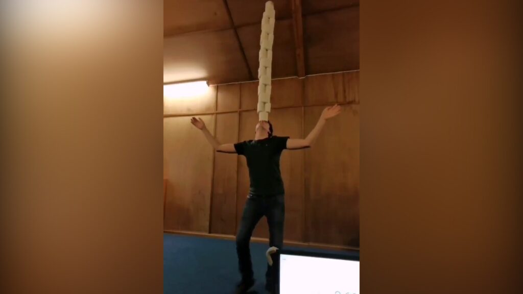 Un video muestra al hombre, llamado Jay Rawlings, balanceando una pila de 46 rollos de papel higiénico en su cabeza como parte del desafío semanal de Guinness World Record.