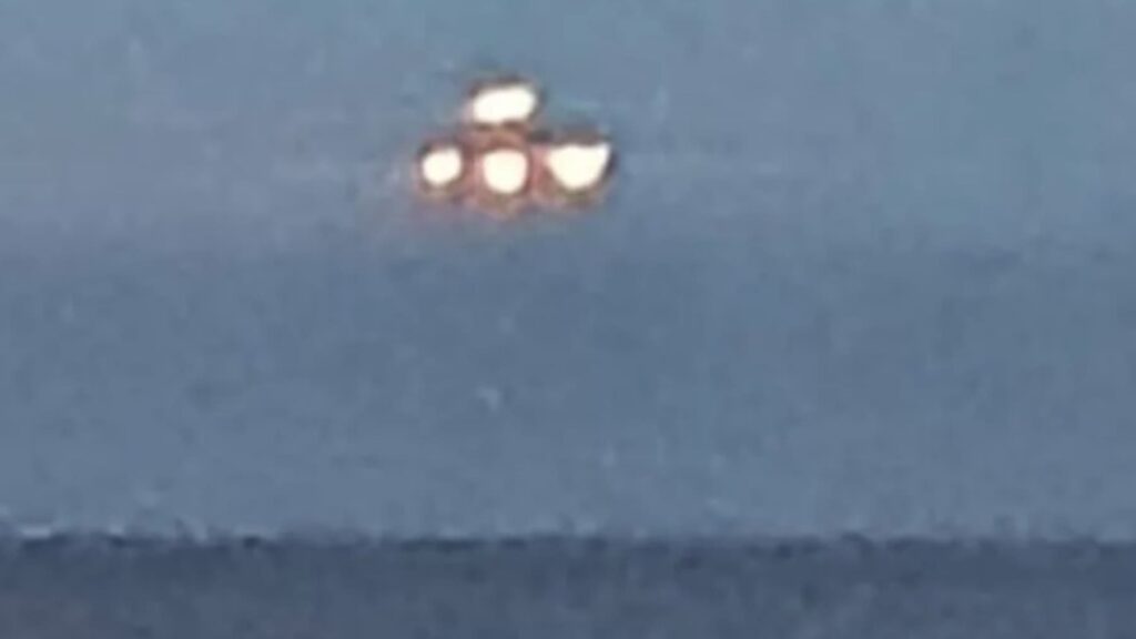 Estaba mirando por la ventana de su casa cuando de pronto vio un objeto no identificado muy brillante. Una vez se fijó en él observó cuatro luces brillantes en una formación triangular que parecían estar suspendidas sobre el agua. Por suerte, el joven tuvo tiempo suficiente para sacar su teléfono móvil y hacer una foto. En poco más de 10 segundos el ovni desapareció y nunca más volvió a verlo.