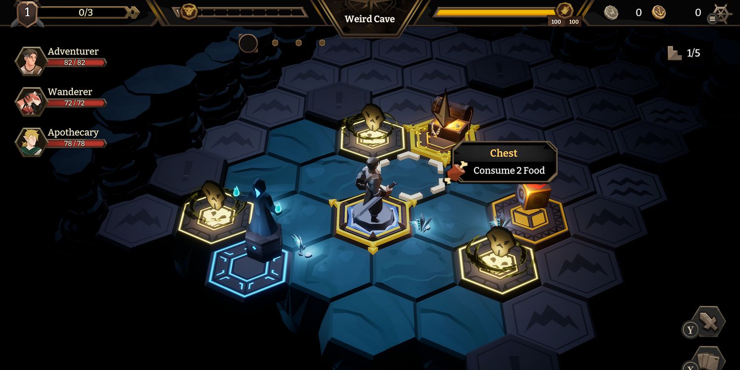 Una vez en el mundo, está claro que este juego está muy influenciado por los juegos de mesa y los TTRPG. El mapa está hecho de hexágonos individuales y el jugador está representado como una miniatura. Las áreas del mapa son pequeñas y cada viaje se compone de tres o cuatro áreas. A medida que los jugadores naveguen por los hexágonos, revelarán peleas, tesoros, bendiciones y algún que otro mercader. Participar en todos estos es una decisión de riesgo/recompensa, ya que los jugadores pueden recibir fuertes habilidades y elementos como armaduras y armas encantadas, o recibir efectos de estado negativos que son difíciles de eliminar.