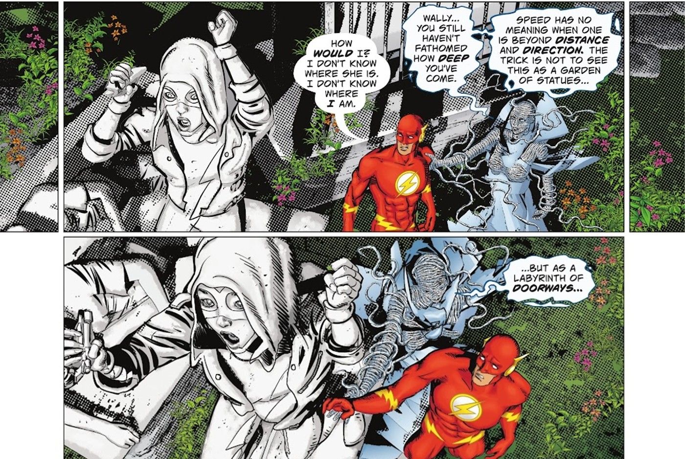 El flash El número 4 está escrito por Si Spurrier y dibujado por Mike Deodato. Wally se encuentra una vez más en el jardín de las estatuas. Allí conoce a un ser llamado “el Resto” que puede ser sólo producto de su imaginación. Las estatuas en el jardín se mueven, inspirando un animado diálogo entre Rest y Wally. Mientras Wally habla sobre el universo con el Resto, su hija Irey se enfrenta al Maestro de los Espejos. Mientras esto sucede, Wally ve una estatua de Irey en el jardín y eso lo devuelve a la realidad.