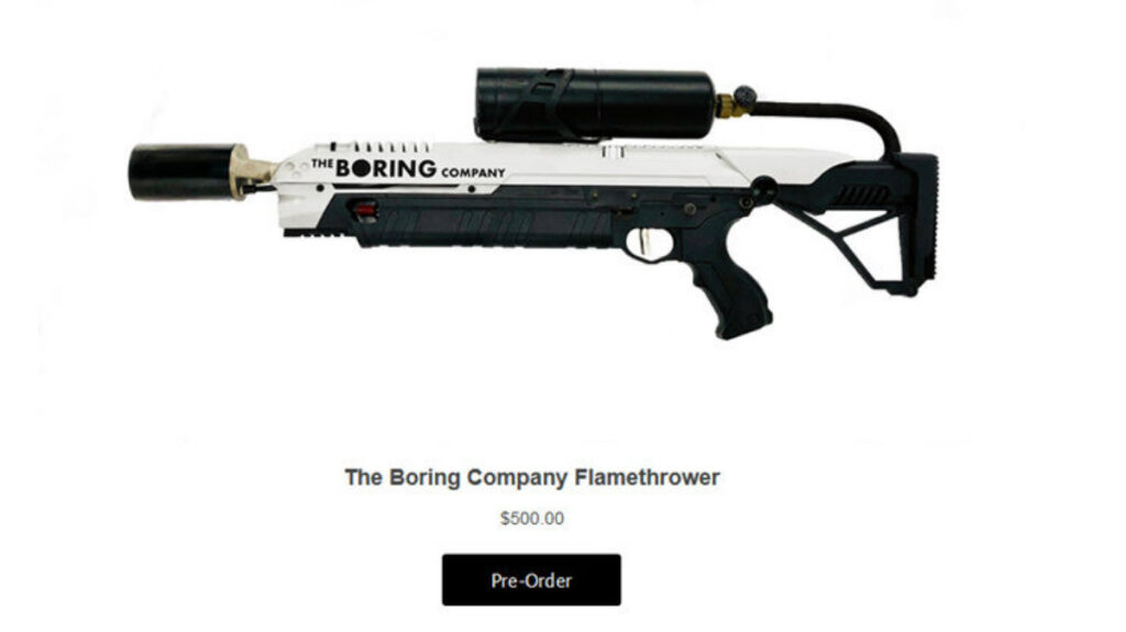 La compañía The Boring Company prometió que pondrían un lanzallamas a la venta por 500 dólares si llegaban a vender 50.000 gorras con el logo de la compañía. Lo lograron y en Navidad anunciaron que pronto se pondría el arma a la venta. Finalmente, este fin de semana comenzaron a aceptarse reservas y ya ha conseguido más de dos millones de dólares en reservas. Más de 20.000 unidades vendidas únicamente el domingo.