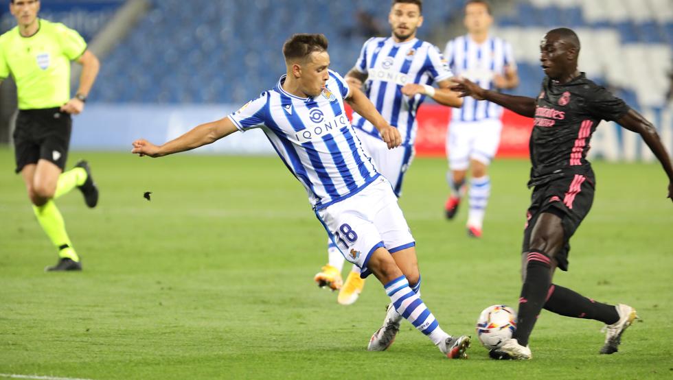 El Madrid salió algo dormido de la caseta y Gorosabel se lució para dejar el detalle técnico del partido. El canterano se zafó de Vinicius, le salió otro defensor y se burló de él con una especie de ruleta girando sobre sí mismo con Zidane sonriendo desde la distancia. Ese movimiento, no demasiado ortodoxo pero sí efectivo, generó un espacio que aprovechó Oyarzabal. La defensa blanca se agrietó y el ‘10’ distribuyó a la izquierda, donde esperaba con la miel en los labios Barrenetxea, que ya sabe lo que es marcarle a Courtois. El donostiarra no atinó en el remate y se esfumó la posibilidad de redondear una jugada mágica que bautizó Gorosabel.