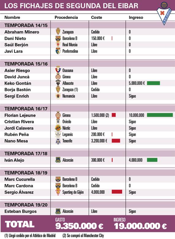 En total, el Eibar se ha gastado 9.350.000 en fichar jugadores de la división de plata que han dejado en caja 19 millones. Es decir, además del buen rendimiento deportivo, el Eibar se ha embolsado casi 10 millones de euros de beneficio con estas operaciones.