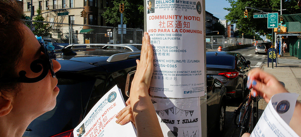 Activistas colocan panfletos donde informan a la comunidad sobre sus derechos ante las redadas implementadas por el presidente Donald Trump.