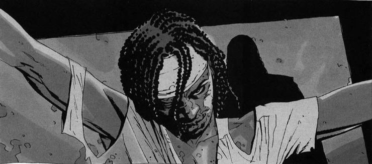 En Los muertos vivientes serie, rara vez se reducen las escenas gráficas o violentas, ya que es uno de los cómics más sangrientos de todos los tiempos. Los lectores se han acostumbrado a momentos terriblemente explícitos, que incluyen ver a los caminantes comer la carne y el interior de muchas personas vivas, un personaje querido al que le aplastan la cabeza con un bate de béisbol e incluso una muerte gráfica que involucra a un bebé a manos del Gobernador. Sin embargo, una de las escenas más controvertidas y gráficas fue transmitida inicialmente por el artista Charlie Adlard que se negó a dibujar.