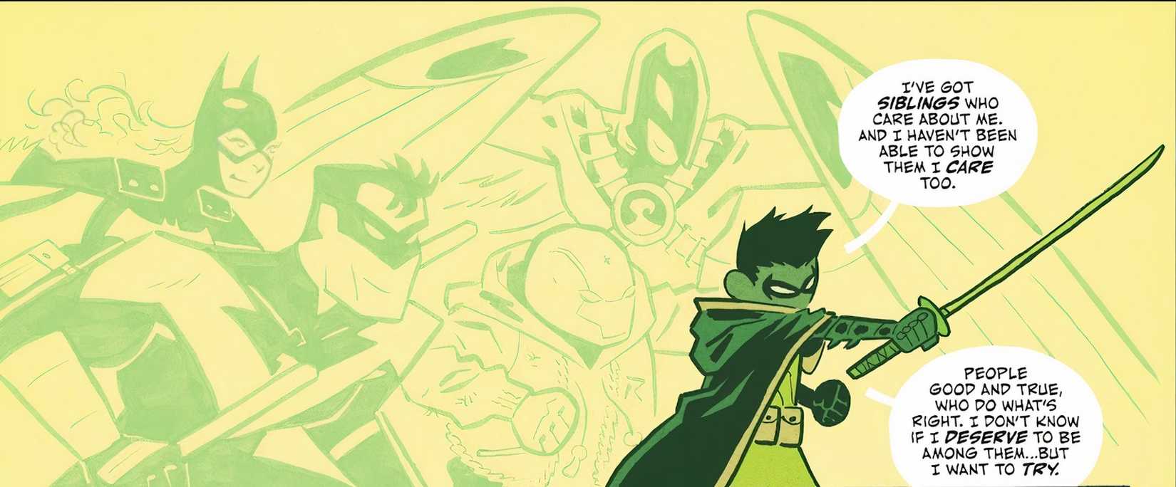 La decisión de Damian de luchar está motivada por el recuerdo de las palabras de aliento de sus hermanos, que le recuerdan que tiene una familia por la que vale la pena vivir. Al reflexionar sobre sus razones para no darse por vencido, Damian dice: “Tengo hermanos que se preocupan por mí y no he podido demostrarles que yo también los quiero… No sé si merezco estar entre ellos… pero quiero intentarlo”. Este momento marca un importante crecimiento del carácter de Damian, demostrando que su deseo de mejorar tiene su raíz en la bondad y la fe que le han demostrado sus hermanos.También es un momento poderoso de la Bat-Familia, que resalta la influencia positiva que sus hermanos tienen sobre él.