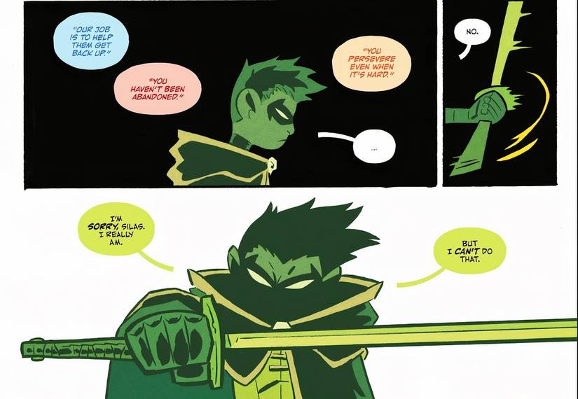 Este número me recordó una de mis citas favoritas sobre la familia de Disney. Lilo & Stitch: “Esta es mi familia. La encontré por mi cuenta. Es pequeña y está rota, pero aún así está bien”. Puede sonar tonto, pero veo muchos paralelismos entre Damian y Stitch. Ambos provienen de entornos implacables, muchos los consideran “malos” y tienen problemas de conducta. Sin embargo, se convierten en mejores versiones de sí mismos gracias a las familias que encuentran. Juni Ba realmente se ha superado a sí mismo al crear un momento de Bat-Familia tan hermoso y creíble, uno que captura perfectamente la esencia de Ala nocturna, Petirrojo, Capucha rojay El petirrojo rojo relación.
