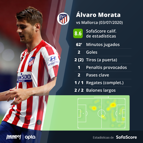 Dos goles de Álvaro Morata, uno de ellos en la repetición de un penalti que falló primero, dieron al delantero madrileño el desquite a su poco protagonismo en este reinicio liguero y, junto al gol final de Koke, llevaron al Atlético a derrotar al Mallorca (3-0) para sumar distancia en la tercera plaza.