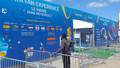 Arriba, un operario de la ‘FIFA Fan Experience’ supervisa que todo esté en orden tras colocar las vallas de acceso a las carpas. Abajo, paneles para promocionar los partidos del Mundial y un tranvía en Le Havre decorado
