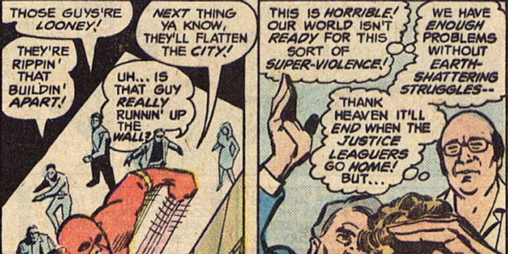 Tanto Ultraa como Julius Schwartz tenían razón: Earth-Prime no estaba lista para los superhéroes, y los eventos de este número demostraron por qué, y en el proceso proporcionaron un comentario sobre los héroes en el mundo real, un poco menos de una década antes. Vigilantes convirtió este tema en oro. Ningún incidente ilustra mejor esto que el Liga de la Justicia intento de frustrar un robo; salió tan mal que llevó a un editor de cómics a concluir que su Tierra estaba mejor sin superhéroes.