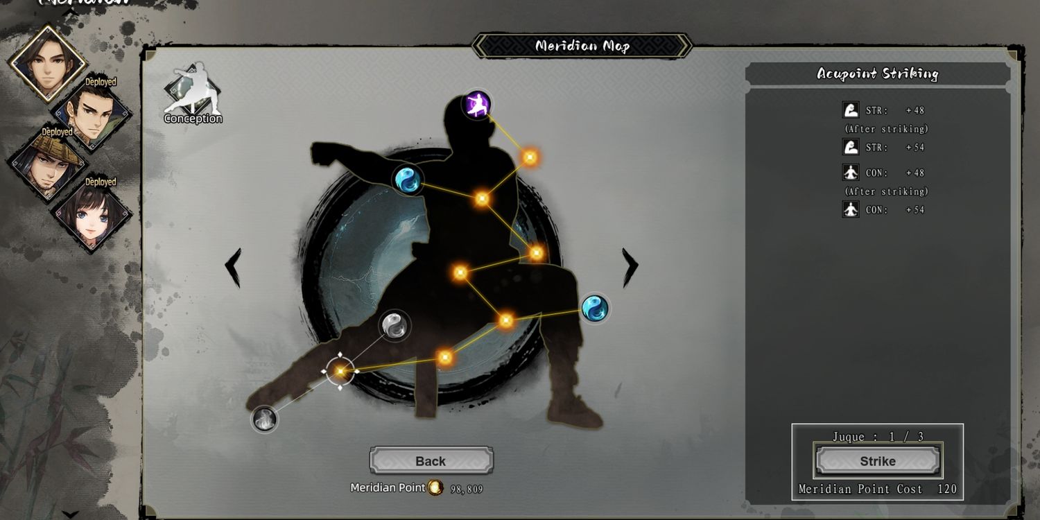 Un problema con el que se encontrarán los jugadores desde el principio es ver cuán pronunciada es la curva de aprendizaje para comprender Espada errante y su mecánica de actualización. Mejorar las habilidades, que a menudo tienen paredes de texto difíciles de descifrar, requiere puntos marciales que se obtienen a través del combate. Gastar estos puntos generará puntos Meridian, que se utilizan para mejorar las estadísticas básicas como la fuerza y la constitución. Para hacerlo, los jugadores deben ir a un menú con varias posturas de artes marciales que representan una estadística determinada y colocar una cierta cantidad de puntos de meridianos en puntos brillantes llamados puntos de acupuntura, lo que dará pequeños aumentos a las estadísticas una vez que se cumpla el requisito de puntos y desbloqueará el camino al siguiente punto de acupuntura y así sucesivamente.
