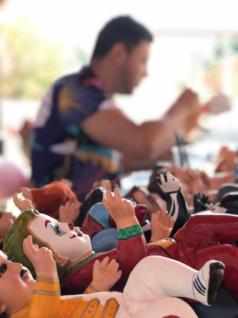 “El proceso es ahora sí que los artesanos me dan la figura en blanco, como está, sin pestañas, sin ninguna decoración y ya yo me encargo de pintarlos, hay personas que me ayudan, no soy el único. Los diseños sí son de mi autoría, pero la pintura sí me ayudan a pintarlos. Me las entregan de esta manera, limpios, y ya yo me encargo de utilizar las pinturas necesarias, lacas y solventes necesarios, ya de ahí es manos a la obra”, expresó.
