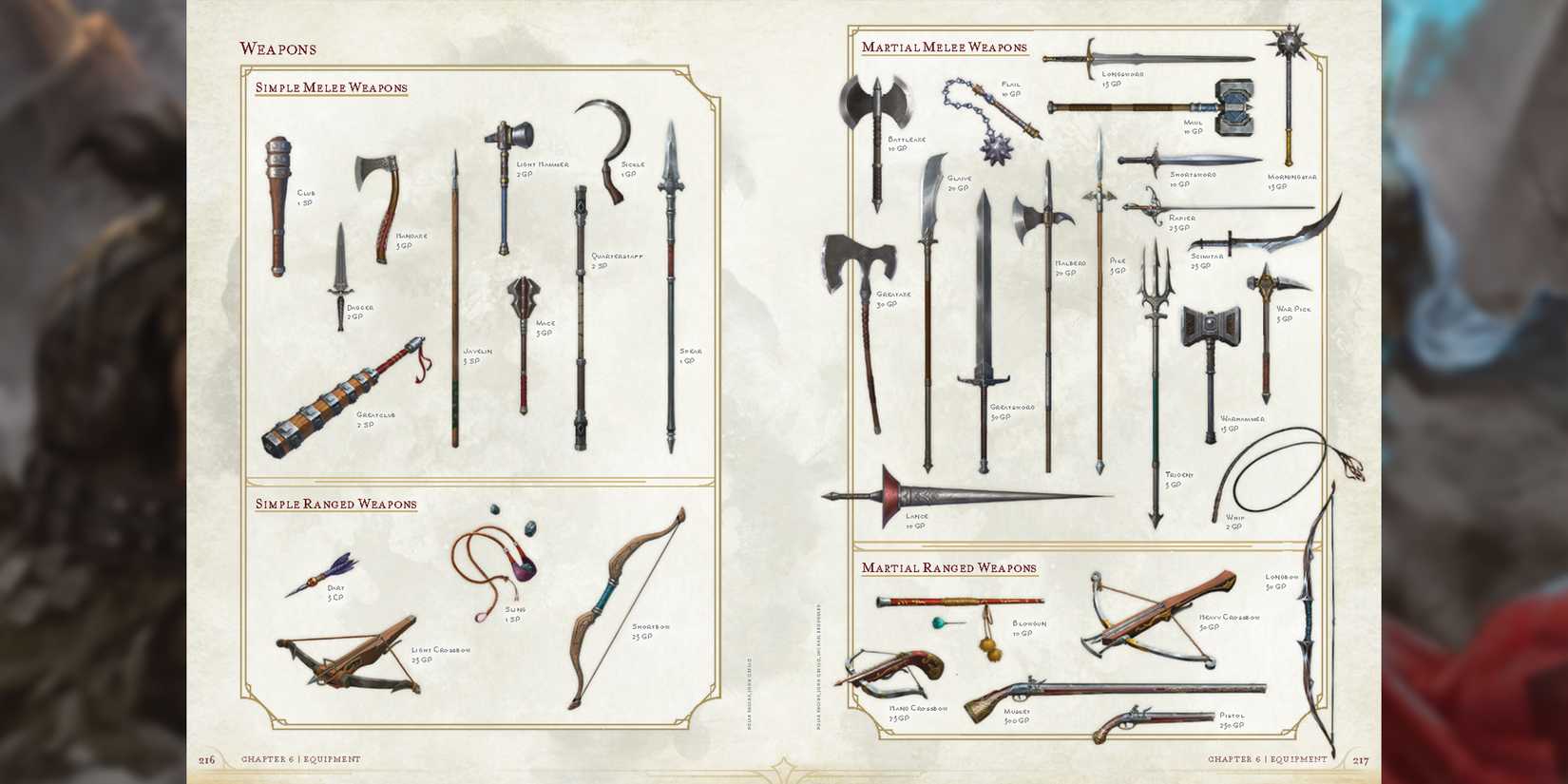 El Manual del jugador está obteniendo una característica nueva y agradable en un diseño que muestra cada elemento básico DND arma y su precio, diseñado para funcionar como una página de catálogo para que los jugadores naveguen. Teniendo en cuenta la importancia de elegir opciones de dominio de armas, esta parece una buena manera de simplificar la presentación, y también podría ser útil hacer referencia a ella mientras se compra dentro de una campaña. Otras adiciones, como nuevas piezas de equipo y características delineadas de dominio de herramientas, completarán el capítulo sobre equipos, y un sistema de elaboración podría ser interesante para los grupos a quienes les gusta hacer sus propios suministros.