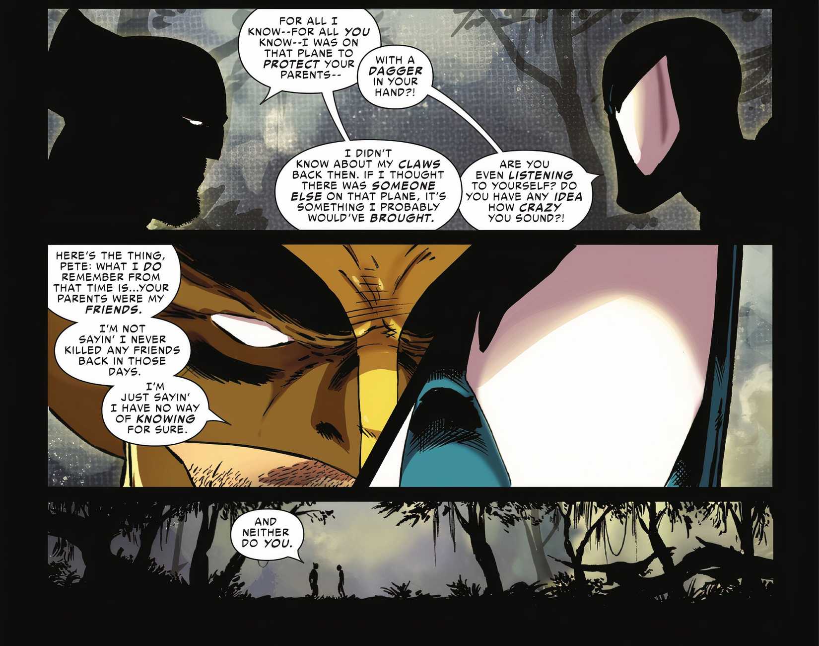 Wolverine se vuelve honesto con Spider-Man. No niega que haya hecho cosas horribles, pero menciona que era capaz de ser bueno incluso en ese entonces. Él dice que era tan probable que los estuviera protegiendo. Peter duda de Logan, pero Wolverine se apega a su historia que Los padres de Spider-Man eran amigos de Logan Y que es probable que no los mate.