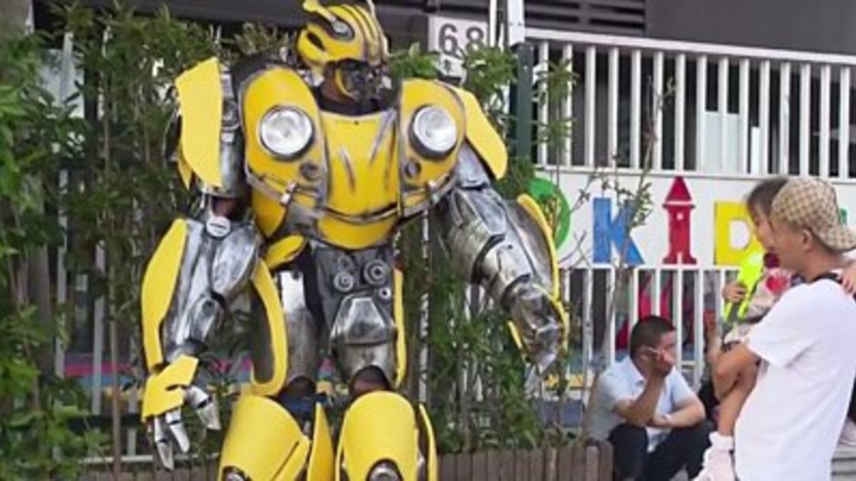 El padre, llamado Zhang, construyó un disfraz inspirado en el personaje de Bumblebee de «Transformers», para sorprender a su hijo en un jardín de infancia en el este de China.