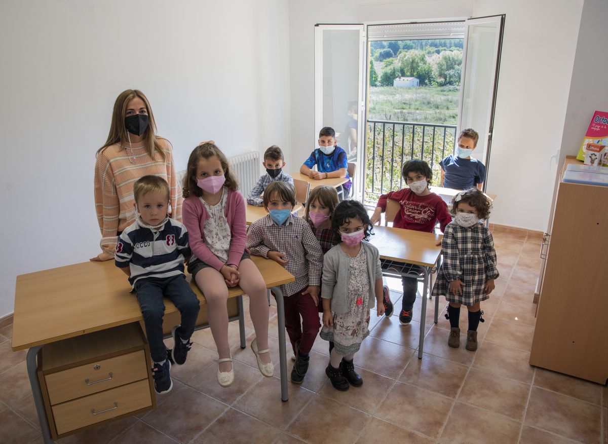 La primera vez que un maestro pisó la escuela de Fuentenava de Jábaga fue en 1877. Había 46 alumnos, dicen los registros. El colegio siguió funcionando casi un siglo, hasta 1972. Es el último lunes de septiembre y María Chumillas, maestra de 29 años del bautizado como colegio Elena Fortún, está nerviosa por el reto que tiene por delante: devolver a la gente joven la confianza de llevar a sus hijos a la escuela del pueblo. “Si conseguimos un alumno más (11), ya podríamos tener dos aulas: una de infantil y otra de primaria”. Mientras habla, un grupo de estudiantes de entre tres y cinco años juega con instrumentos de cocina de plástico y otro de hasta 11 descifra los autores de algunas canciones de música clásica en la pizarra interactiva. “Tienen intereses diferentes, pero se cuidan, es importante ese aprendizaje”, dice.