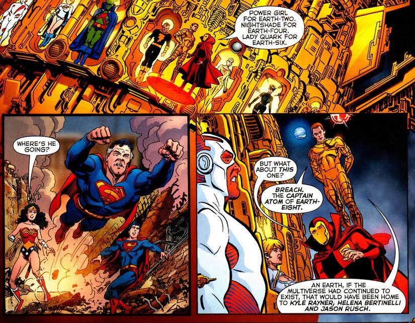 La declaración más sorprendente es cuando grita Green Lantern Kyle Rayner por haber sido originalmente destinado a Tierra-8pero desde que el Multiverso colapsó en Crisis en Tierras Infinitas por Marv Wolfman y George Pérez, Kyle terminó en la Tierra principal.