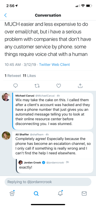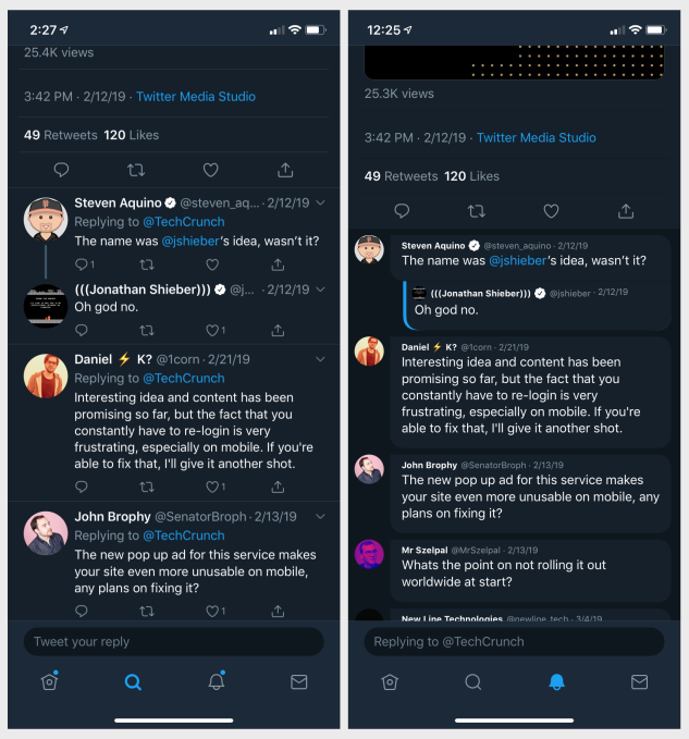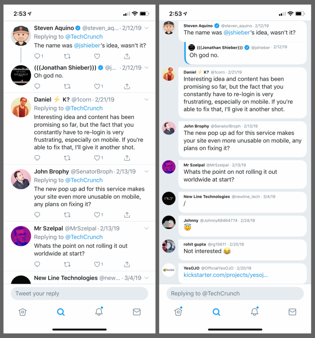 En la foto de la izquierda, puede ver cómo se manejan las Respuestas hoy en día: una línea delgada y gris conecta a la persona que responde a otro usuario dentro de la conversación más amplia que se realiza debajo del tweet original. En la foto, el editor de TechCrunch, Jonathan Shieber, responde tanto al tweet de TechCrunch como a la persona que lo etiquetó en una pregunta en su propia respuesta al tweet de TC.