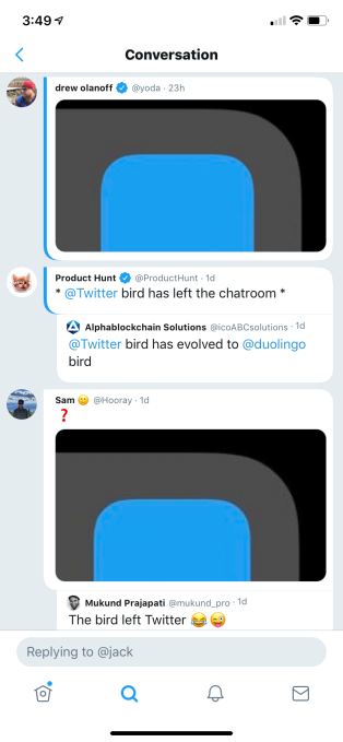 En la versión pública de la aplicación de Twitter, el cartel original también se resalta en el hilo de respuesta con una etiqueta prominente de "Original Tweeter". En el prototipo, sin embargo, están designados solo por una línea de color al lado de su nombre, en el lado izquierdo de la burbuja de chat. (Ver el tweet de Jordan arriba).