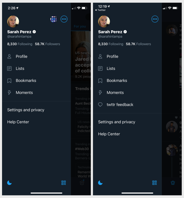 A continuación se muestran algunas capturas de pantalla de cómo se ve la aplicación pública de Twitter en comparación con el nuevo prototipo, además de otras características que se encuentran solo en twttr.