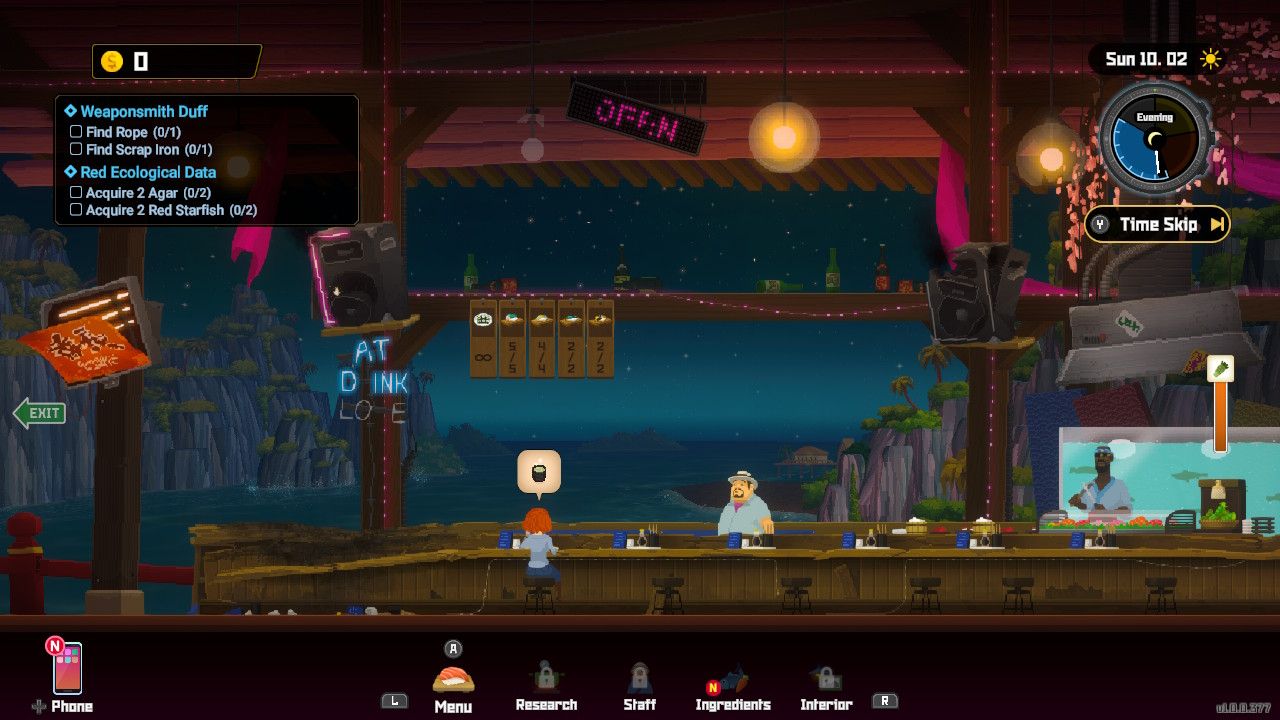 El juego nocturno, por otro lado, presenta a Dave luchando para ayudar en un restaurante de sushi, uno que utiliza los ingredientes que pesca durante el día, junto con su trabajo físico para ayudar a los invitados. Es un simulador de gestión divertido que, a pesar de ser funcionalmente diferente de los demás elementos del juego, une perfectamente el ciclo diario de Dave el buceador.