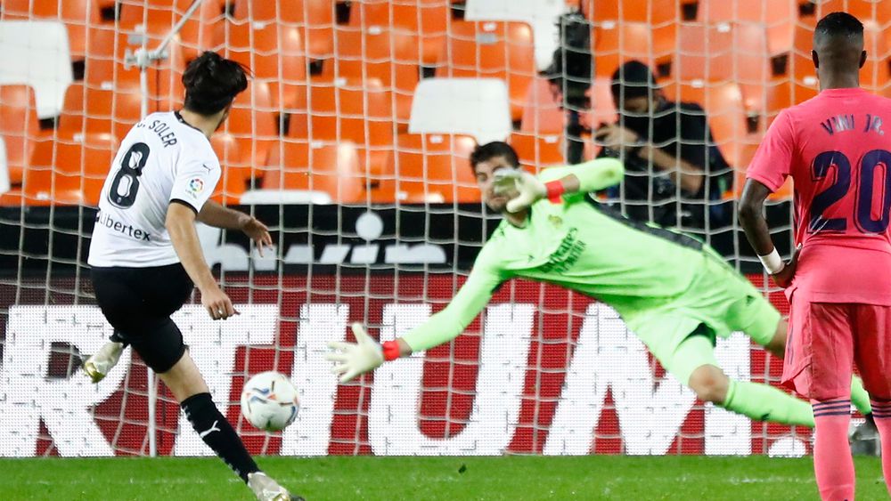 Todo a los pies del Real cuando Gayá, cómo no, tiró un centro y Lucas saltó con un brazo al viento. A los futbolistas deberían amarrarles las manos en los entrenamientos. Hoy el cante del VAR obliga. Entonces llegó un penalti eterno. Lanzó Soler, se lo paró Courtois y el rechace le llegó al propio Soler con la portería en las narices y despejada. El valencianista, no se sabe cómo, se estrelló con un poste. Musah llegó al segundo rebote y festejó el emboque. Mal hecho. Un chivatazo del VAR delató que Musah tenía un callo sobre la línea del área antes de disparar Soler. Ahí no quedó la cosa. Otro soplo: Lucas también pisaba el área. Penalti a repetir. Soler lo ejecutó igual. Courtois no se lo detuvo por un dedo.