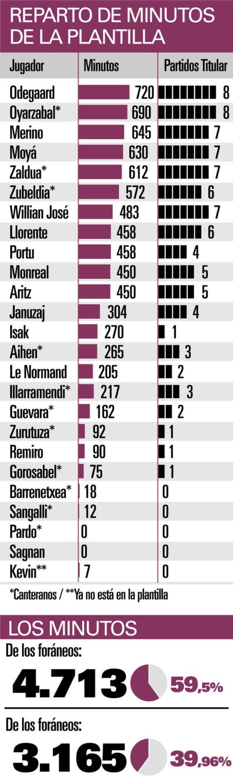 El reparto de minutos entre foráneos y canteranos no sólo es desigual en lo que se refiere al cómputo global. No se puede perder de vista que entre cuatro de los doce canteranos que figuran en el primer equipo (Oyarzabal, Zubeldia, Zaldua y Aritz