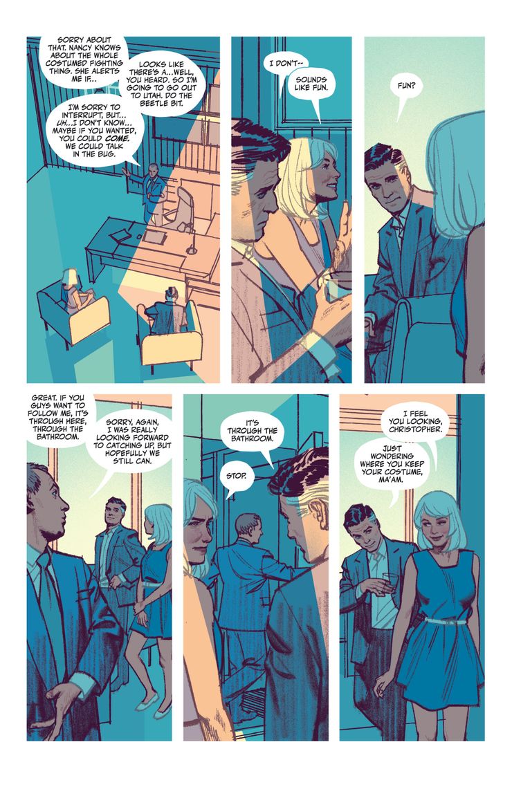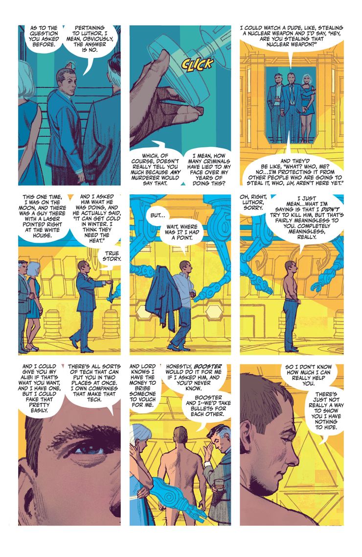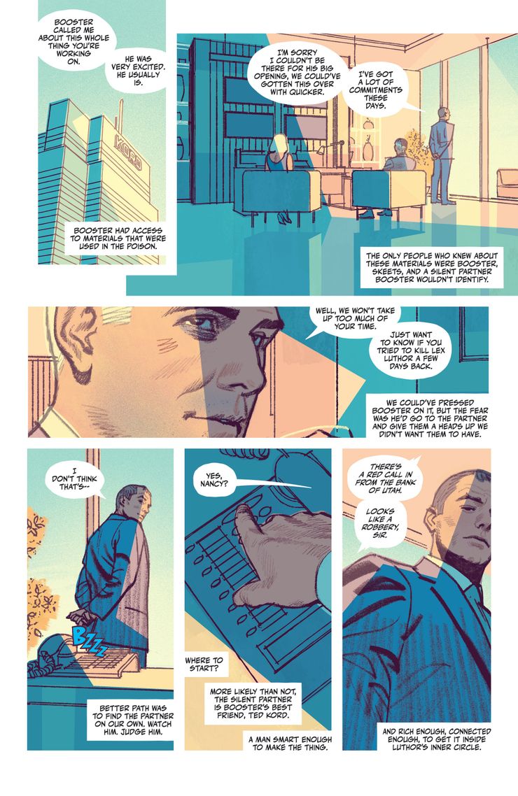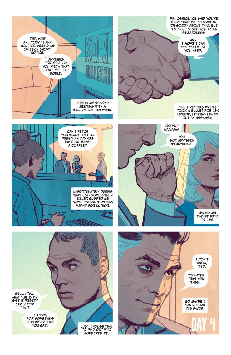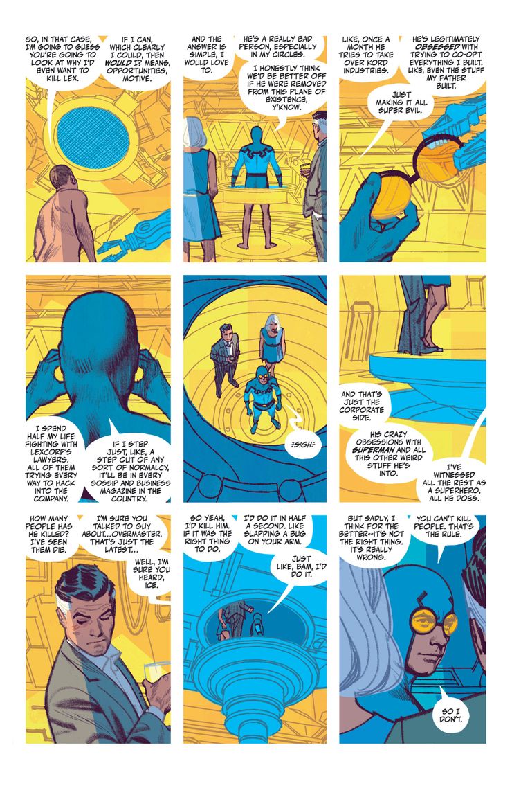 Christopher Chance, junto con el compañero de Liga de Beetle, Ice, llegan a la sede mundial de Kord Industries. Beetle niega haber matado a Lex Luthor, pero también admite que el mundo sería mejor sin él. Beetle continúa revelando que Luthor intenta, al menos una vez al mes, hacerse cargo de Kord Industries, y que ha pasado la mitad de su vida luchando contra los abogados de LexCorp, cada uno tratando de abrirse camino en la empresa. Beetle también revela que Luthor quiere Industrias Kord porque está obsesionado con obtener su tecnología, incluso los dispositivos construidos por el padre de Beetle. Después de recordarle a Chance la obsesión de Luthor por matar a Superman y otros héroes, Beetle dice que en realidad mataría a Luthor “si fuera lo correcto”. Sin embargo, Beetle concluye que esto no es prudente y los tres parten en el avión de Beetle.