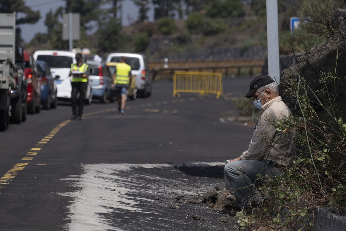 Es mediodía del sábado. El sol cae con fuerza sobre la carretera LP 2, en el punto de acceso a la localidad de Jedey (Los Llanos de Aridane), evacuada desde el pasado domingo 19 de septiembre tras la erupción del volcán de La Palma. Una larga cola de coches, cercana al kilómetro, espera su turno para atravesar el improvisado control que la Guardia Civil ha instalado para impedir el acceso a la zona.