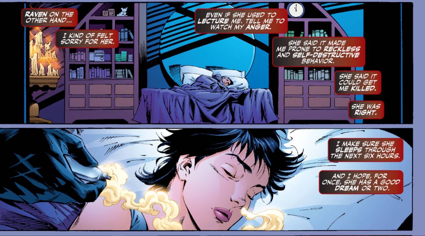 Mientras Jason derrota a los Titanes, se asegura de ser especialmente amable con Raven. Jason comenta que Raven, al ser un poderoso empático, siempre sintió la rabia que había en él y trató de advertirle que no la hiciera.. Esta es una de las muchas razones por las que Jason siente que los Jóvenes Titanes podrían haberlo salvado si le hubieran permitido ingresar al equipo.
