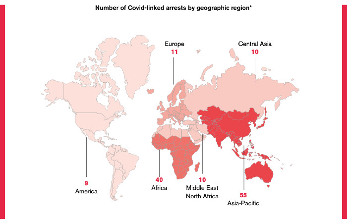 Respecto a la situación en Asia, RSF indicó que es el continente en el que se han producido más violaciones de la libertad de prensa relacionadas con la pandemia y donde se concentra la mayor cifra de detenidos por temas relacionados con el Covid-19: 7 en China, 2 en Bangladesh y 1 en Birmania.